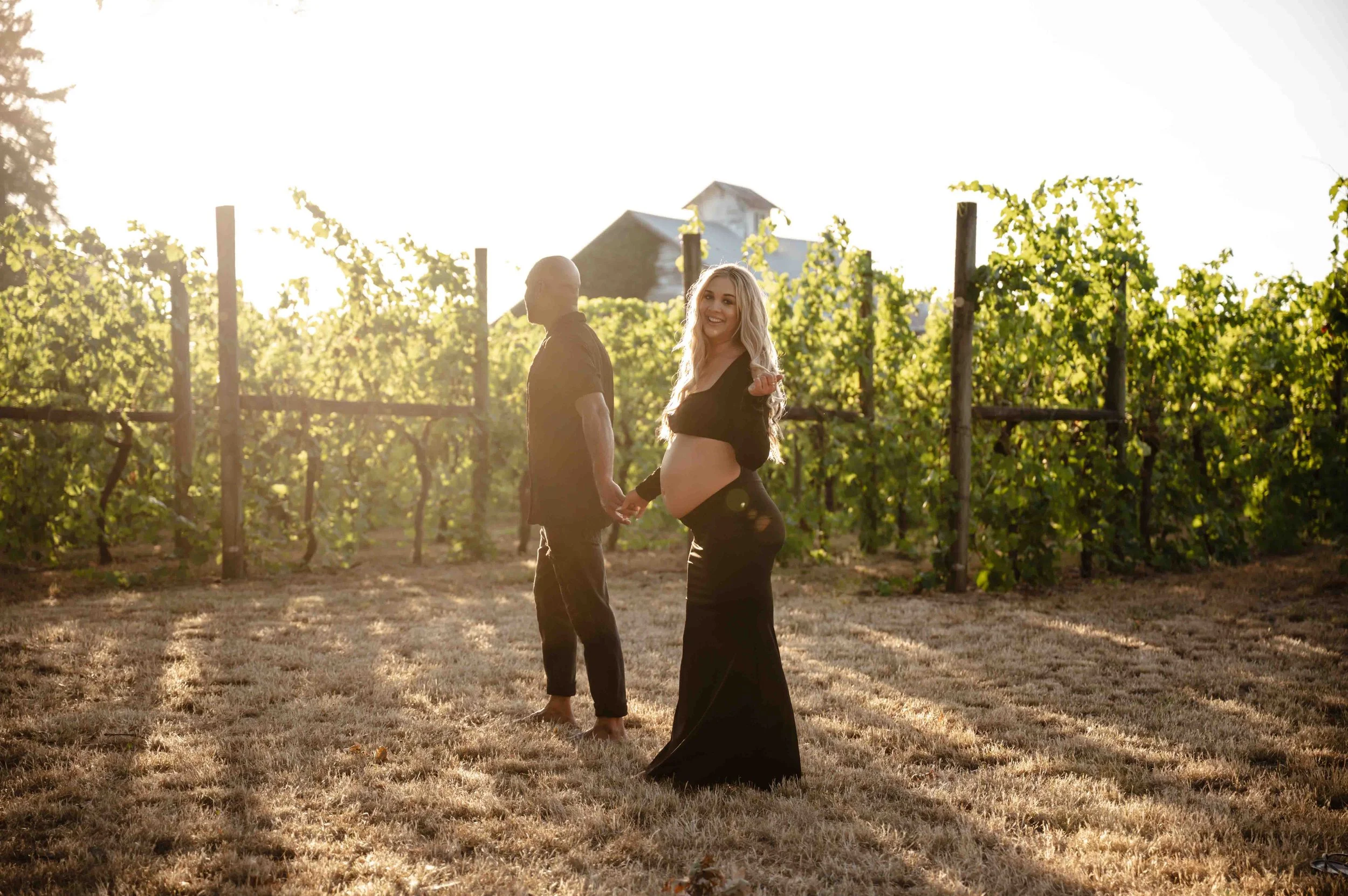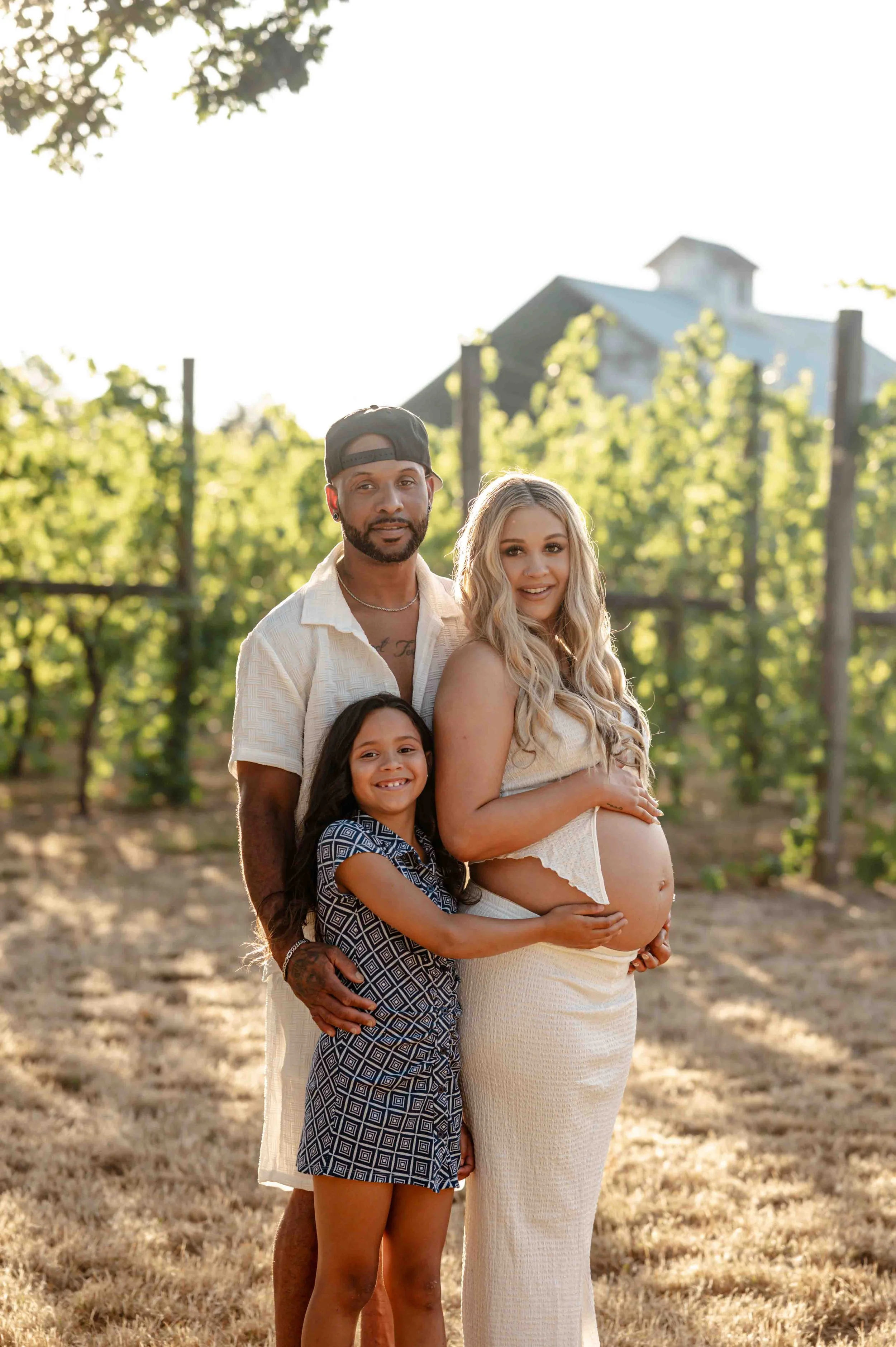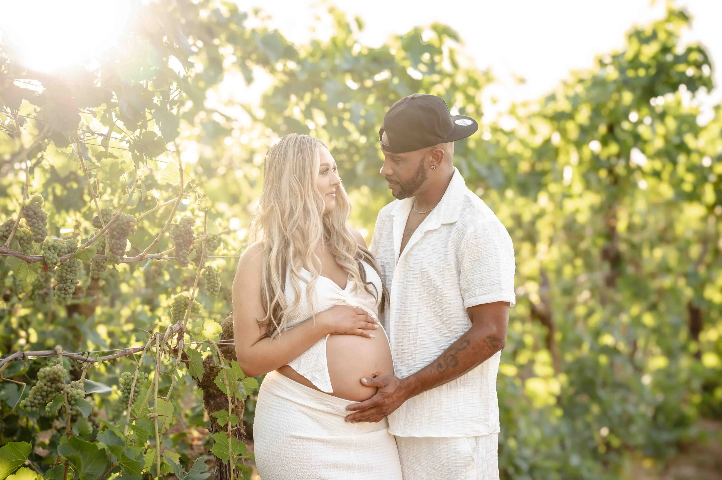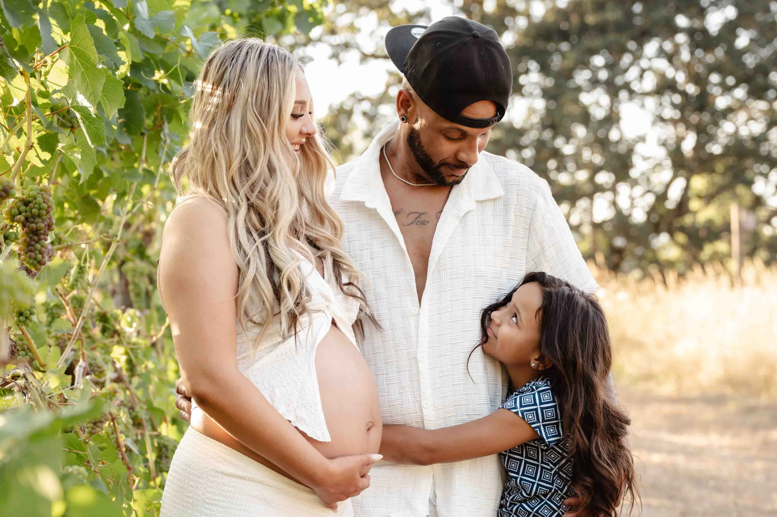 When your backyard is a literal vineyard, there’s really only one thing to do—plan a photo session, of course! Rows of lush green vines with golden sunlight streaming through the leaves, tall, dry grass and flowers, and the big oak trees made the perfect backdrop. With their sweet little one arriving next month, Whitney knew she wanted to capture this chapter in the dreamy glow of golden hour. Capturing some of the grapes on the vines, soaking in the magic of the evening, and every frame was filled with closeness, anticipation, and just a hint of that “can’t wait to meet you” feeling.